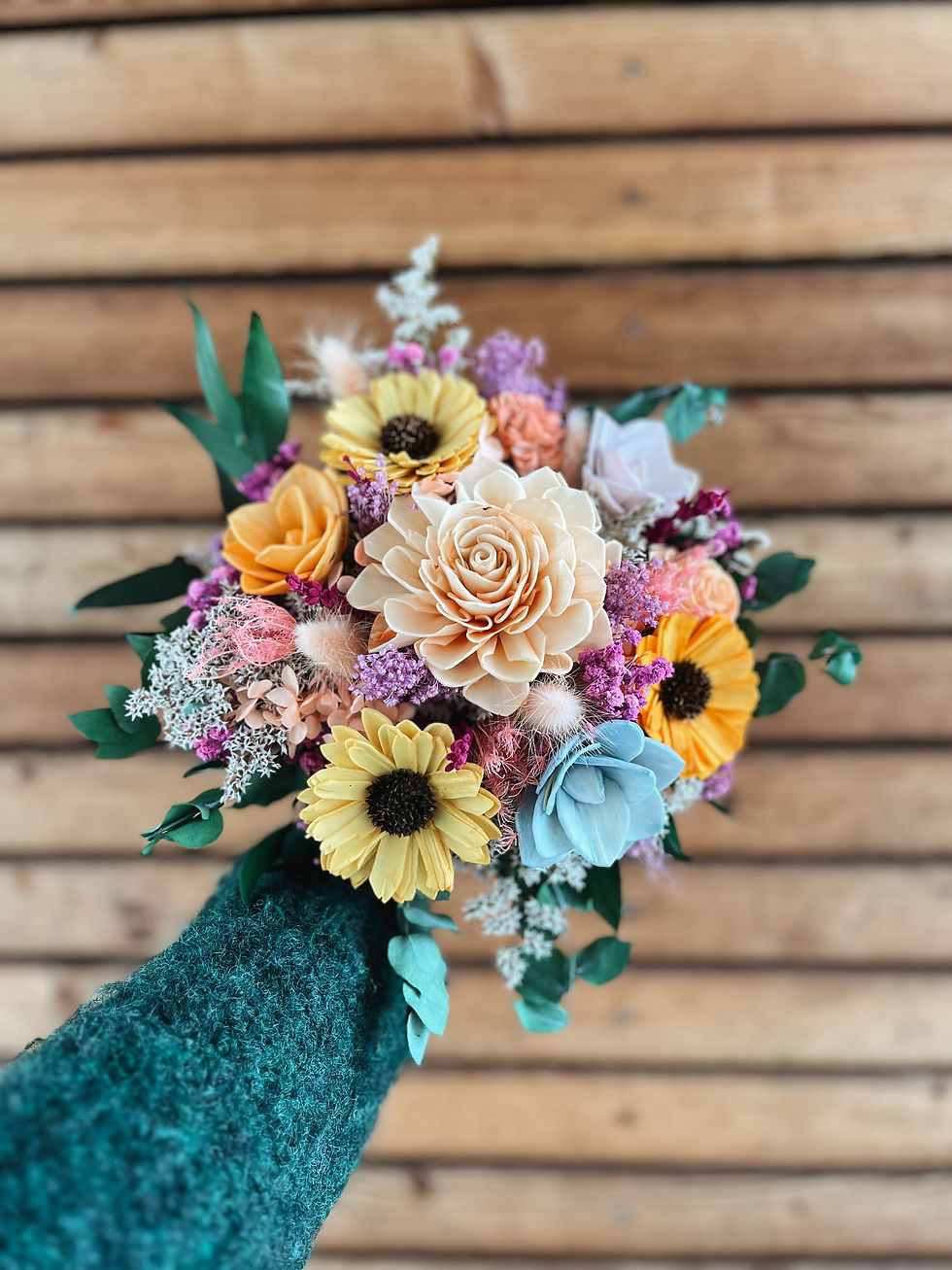 Diese liebevoll gefertigte Sträuße vereint die natürliche Schönheit haltbarer Trockenblumen mit von Hand gefärbten Solaholz-Blumen – perfekt, um besondere Momente festzuhalten.